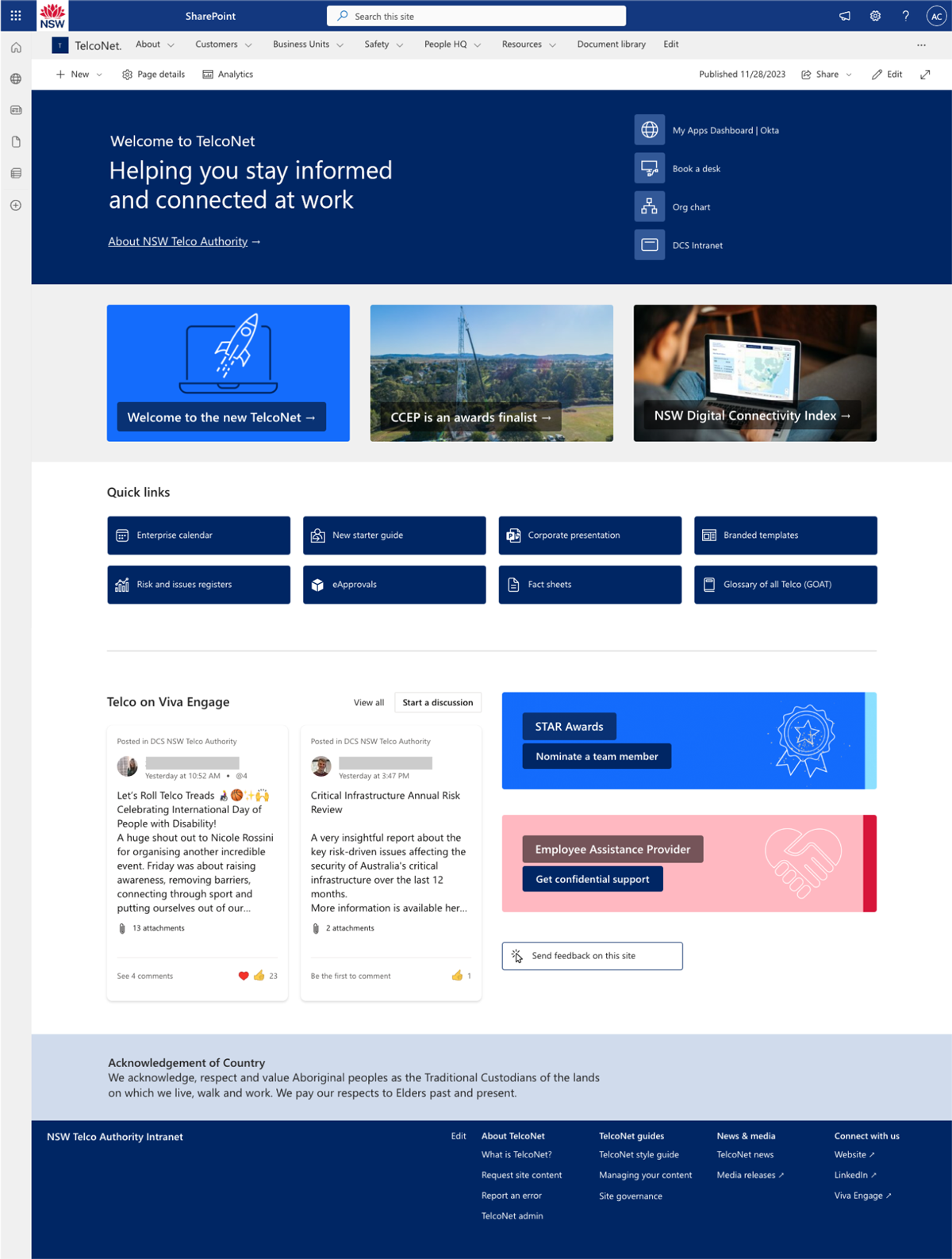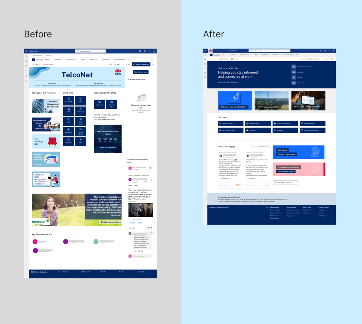 The Telco SharePoint intranet was only 18 months old but it was receiving negative feedback and low engagement. Leadership saw value in the site but the team in charge was struggling to make the navigation and layout changes required to make it a useful resource Telco wide. I was engaged full-time for 6 months to refresh the site.