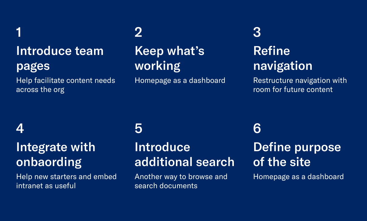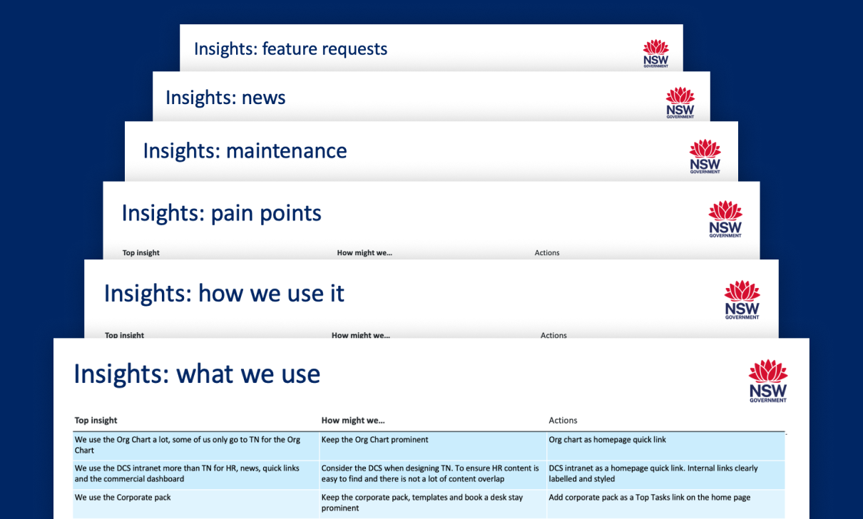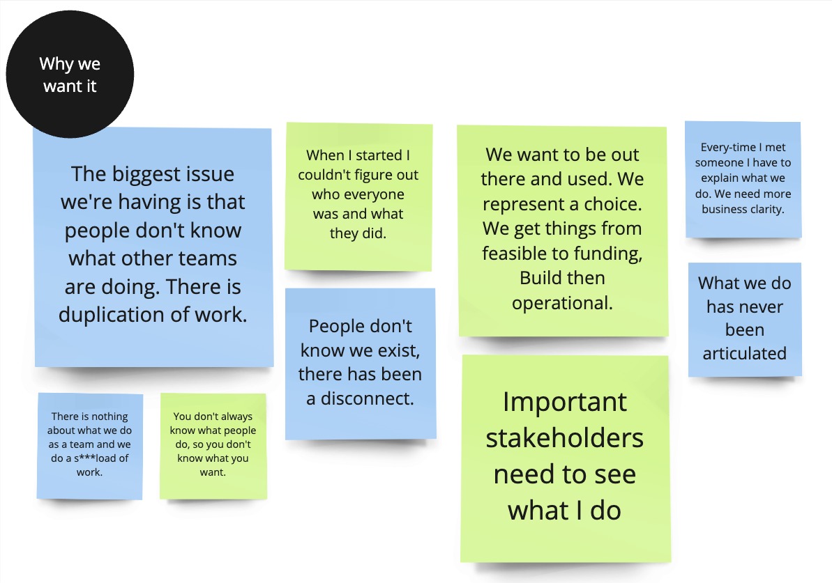 I presented the top insight and ask back to senior leaders in business unit leadership meetings. Feedback was positive, if sometimes hesitant, and with these approvals sought I could power on with the project plan and the goal of building a useful, sustainable site.
