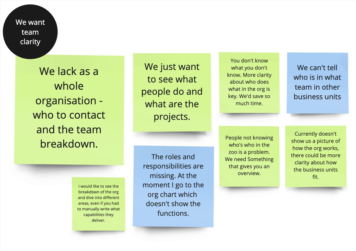 Organisation clarity was asked for by roughly 90% of participants. Everything from high level information to individual capabilities. The reasons ranged from acknowledgement of work done and promoting services offered through to breaking down silos and reducing duplication of work.